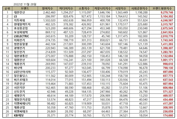 [이넷뉴스] 2022년 11월 전기장비 관련 상장기업 브랜드평판이 공개됐다.