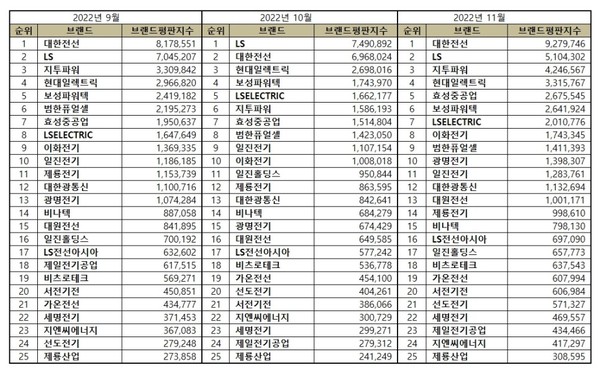 전기장비 상장기업 브랜드평판 2022년 11월 빅데이터 분석 순위는 대한전선, LS, 지투파워, 현대일렉트릭, 효성중공업, 보성파워텍, LSELECTRIC, 이화전기, 범한퓨얼셀, 광명전기, 일진전기, 대한광통신, 대원전선, 제룡전기, 비나텍, LS전선아시아, 일진홀딩스, 비츠로테크, 가온전선, 서전기전, 선도전기, 세명전기, 제일전기공업, 지엔씨에너지, 제룡산업, 피앤씨테크, KBI메탈 순이었다.