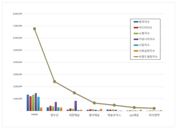 해운 상장기업 브랜드평판 1위를 기록한 HMM ( 대표 김경배 ) 브랜드는 참여지수 1,337,171 미디어지수 1,203,933 소통지수 1,325,424 커뮤니티지수 1,467,375 시장지수 1,162,101 사회공헌지수 282,635가 되면서 브랜드평판지수 6,778,638로 분석됐다. 지난 8월 브랜드평판지수 7,179,380과 비교하면 5.58% 하락했다.