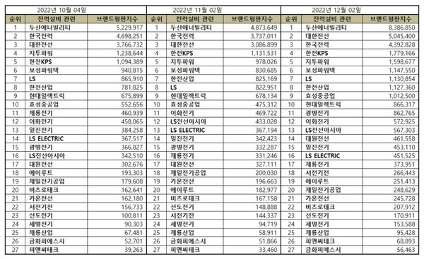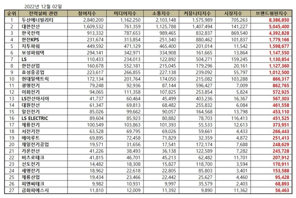 전력설비 상장기업 브랜드평판 2022년 12월 빅데이터 분석 순위는 두산에너빌리티, 대한전선, 한국전력, 한전KPS, 지투파워, 보성파워텍, LS, 한전산업, 효성중공업, 현대일렉트릭, 광명전기, 이화전기, LS전선아시아, 대원전선, 일진전기, LS ELECTRIC, 제룡전기, 서전기전, 에이루트, 제일전기공업, 가온전선, 비츠로테크, 선도전기, 세명전기, 제룡산업, 피앤씨테크, 금화피에스시 순이었다.