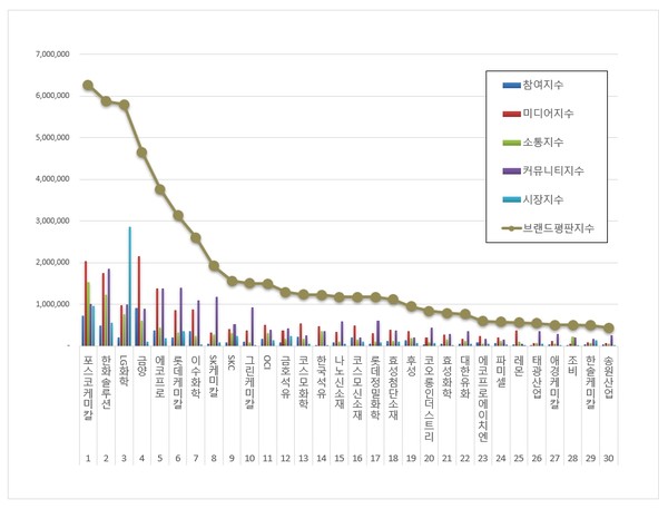 2022년 12월 화학 상장기업 브랜드평판 30위 순위는 포스코케미칼, 한화솔루션, LG화학, 금양, 에코프로, 롯데케미칼, 이수화학, SK케미칼, SKC, 그린케미칼, OCI, 금호석유, 코스모화학, 한국석유, 나노신소재, 코스모신소재, 롯데정밀화학, 효성첨단소재, 후성, 코오롱인더스트리, 효성화학, 대한유화, 에코프로에이치엔, 파미셀, 레몬, 태광산업, 애경케미칼, 조비, 한솔케미칼, 송원산업 순으로 분석됐다.