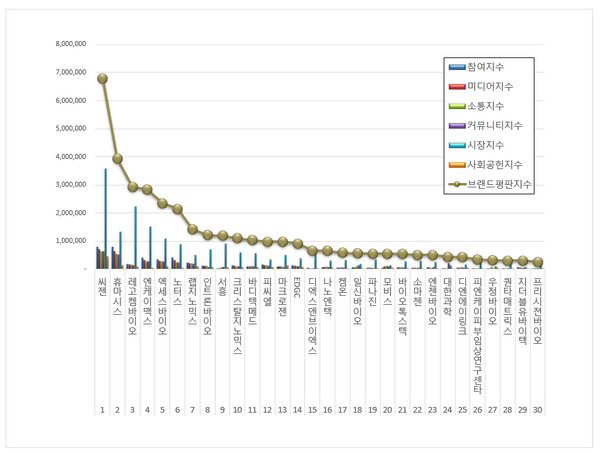 3위, 레고켐바이오 ( 대표 김용주 ) 브랜드는 참여지수 176,694 미디어지수 157,760 소통지수 150,843 커뮤니티지수 134,344 시장지수 2,223,863 사회공헌지수 85,089가 되면서 브랜드평판지수 2,928,594로 분석됐다. 지난 11월 브랜드평판지수 2,530,555와 비교하면 15.73% 상승했다.