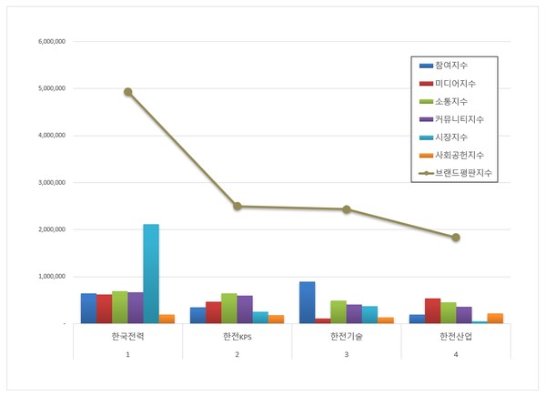 전기 유틸리티 상장기업 브랜드평판 1위를 기록한 한국전력 ( 대표 정승일, 한국전력공사 ) 브랜드는 참여지수 642,802 미디어지수 621,201 소통지수 689,475 커뮤니티지수 669,188 시장지수 2,122,474 사회공헌지수 193,340이 되면서 브랜드평판지수 4,938,479로 분석되었다. 지난 11월 브랜드평판지수 4,057,125와 비교하면 21.72% 상승했다.