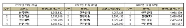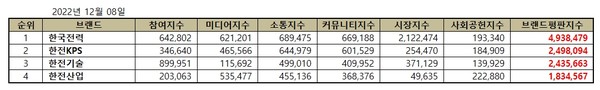 2022년 12월 전기 유틸리티 상장기업 브랜드평판 순위는 한국전력, 한전KPS, 한전기술, 한전산업 순으로 분석됐다.