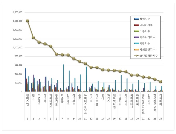 컴퓨터 주변기기 상장기업 브랜드평판 분석은 참여지수, 미디어지수, 소통지수, 커뮤니티지수, 시장지수, 사회공헌지수로 구분하여 브랜드평판지수를 산출했다.