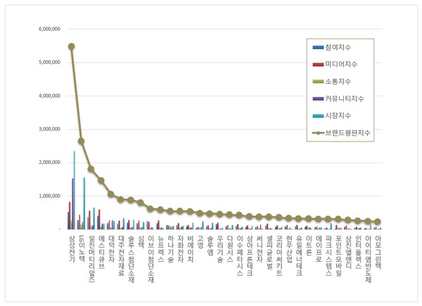 전자장비 상장기업 브랜드평판 분석은 참여지수, 미디어지수, 소통지수, 커뮤니티지수, 시장지수로 구분하여 브랜드평판지수를 산출했다.