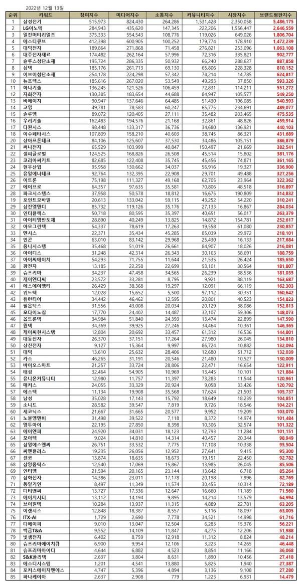 한국기업평판연구소 구창환 소장은 "2022년 12월 전자장비 상장기업 브랜드평판 결과, 삼성전기 ( 대표 장덕현 ) 브랜드가 1위로 분석되었다. 전자장비 상장기업 빅데이터 분석을 해보니 브랜드소비 5.74% 상승, 브랜드이슈 1.40% 상승, 브랜드소통 0.59% 상승, 브랜드확산 14.21% 하락, 브랜드시장 0.84% 하락했다"라고 밝혔다.