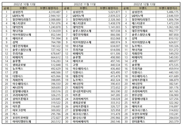 [이넷뉴스] 2022년 12월 전자장비 상장기업 브랜드평판이 공개됐다.