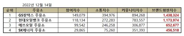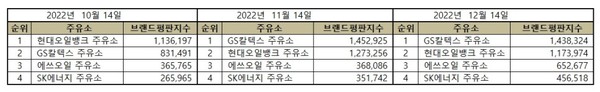 이넷뉴스와 한국기업평판연구소는 소비자들에게 사랑받는 주유소 브랜드에 대해 브랜드 빅데이터를 통한 평판조사를 하였다. 4개 주유소 브랜드평판 분석은 2022년 11월 14일부터 2022년 12월 14일까지의 주유소 브랜드 빅데이터 3,721,493개를 분석하여 소비자들의 브랜드 습관과 브랜드와 관계 분석을 통해 브랜드평판을 분석하였다. 지난 11월 브랜드 빅데이터 3,446,009개와 비교하면 7.99% 증가했다.