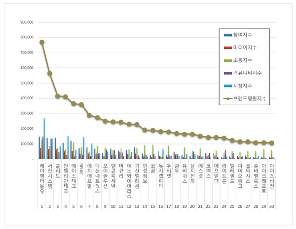 통신장비 상장기업 브랜드평판 분석은 참여지수, 미디어지수, 소통지수, 커뮤니티지수, 시장지수로 구분하여 브랜드평판지수를 산출했다.