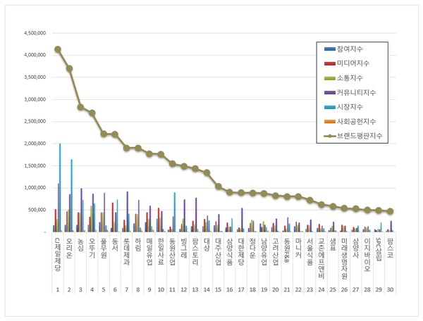 식품 상장기업 브랜드평판 1위를 기록한 CJ제일제당 브랜드는 참여지수 162,508 미디어지수 522,135 소통지수 294,966 커뮤니티지수 1,104,526 시장지수 2,010,214 사회공헌지수 45,596이 되면서 브랜드평판지수 4,139,945로 분석됐다. 지난 11월 브랜드평판지수 4,035,097과 비교해보면 2.60% 상승했다.
