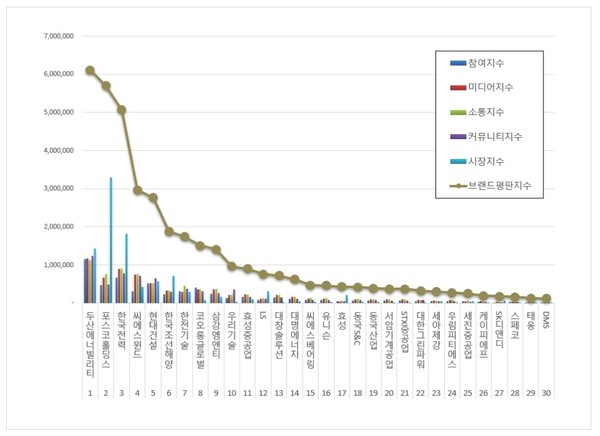 풍력에너지 관련 상장기업 브랜드평판 1위를 기록한 두산에너빌리티 브랜드는 참여지수 1,158,678 미디어지수 1,165,100 소통지수 1,124,013 커뮤니티지수 1,235,944 시장지수 1,425,181이 되면서 브랜드평판지수 6,108,915로 분석됐다. 지난 11월 브랜드평판지수 6,702,028과 비교해보면 8.85% 하락했다.