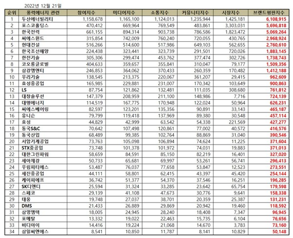 풍력에너지 관련 상장기업 브랜드평판 2022년 12월 빅데이터 분석 30위 순위는 두산에너빌리티, 포스코홀딩스, 한국전력, 씨에스윈드, 현대건설, 한국조선해양, 한전기술, 코오롱글로벌, 삼강엠앤티, 우리기술, 효성중공업, LS, 대창솔루션, 대명에너지, 씨에스베어링, 유니슨, 효성, 동국S&C, 동국산업, 서암기계공업, STX중공업, 대한그린파워, 세아제강, 우림피티에스, 세진중공업, 케이피에프, SK디앤디, 스페코, 태웅, DMS 순이었다.
