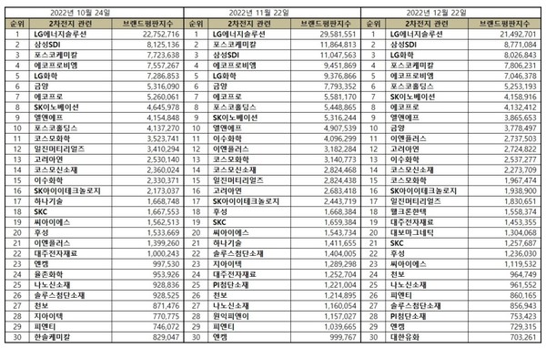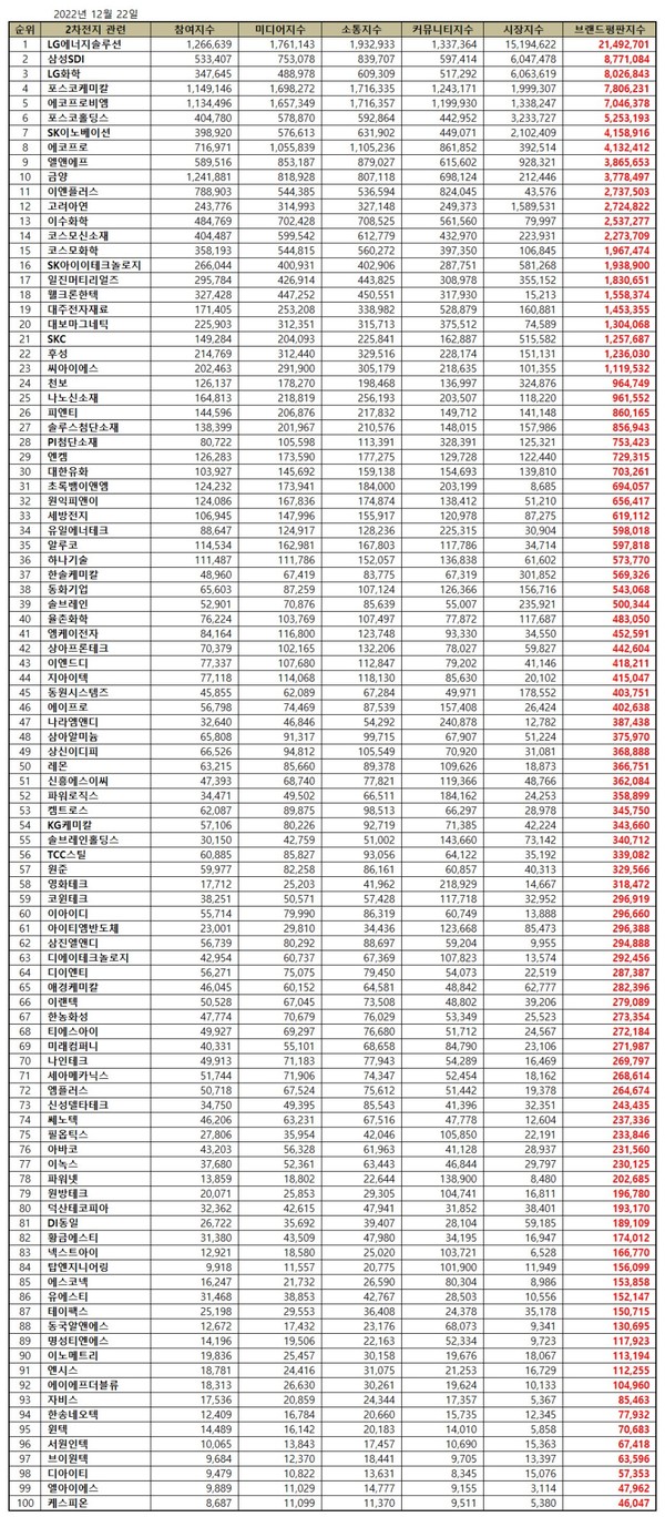 [이넷뉴스] 2022년 12월 2차전지 관련 상장기업 브랜드평판이 공개됐다.