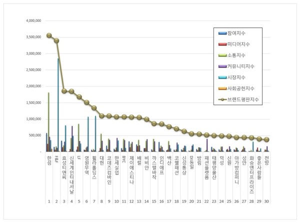 3위, 효성티앤씨 브랜드는 참여지수 344,715 미디어지수 144,935 소통지수 204,337 커뮤니티지수 316,688 시장지수 810,420 사회공헌지수 33,553이 되면서 브랜드평판지수 1,854,649로 분석됐다. 지난 11월 브랜드평판지수 1,826,342와 비교해보면 1.55% 상승했다.