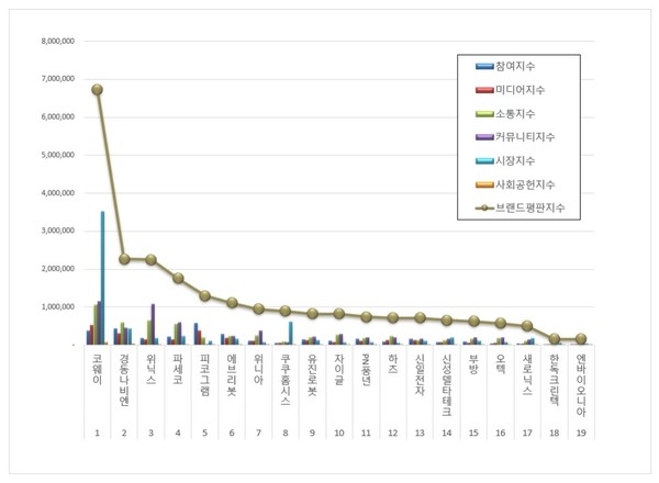 가정용품 상장기업 브랜드평판 1위를 기록한 코웨이 브랜드는 참여지수 374,306 미디어지수 530,931 소통지수 1,060,888 커뮤니티지수 1,149,434 시장지수 3,523,637 사회공헌지수 80,036이 되면서 브랜드평판지수 6,719,231로 분석됐다. 지난 11월 브랜드평판지수 6,885,999와 비교해보면 2.42% 하락했다.