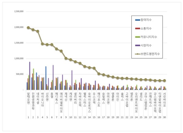 생물공학 상장기업 브랜드평판 분석은 참여지수, 소통지수, 커뮤니티지수, 시장지수로 구분하여 브랜드평판지수를 산출했다.
