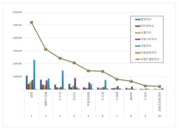5위, 현대리바트 브랜드는 참여지수 176,362 미디어지수 134,946 소통지수 146,119 커뮤니티지수 556,921 시장지수 416,890 사회공헌지수 39,387이 되면서 브랜드평판지수 1,470,626으로 분석됐다. 지난 11월 브랜드평판지수 2,307,113과 비교해보면 36.26% 하락했다.