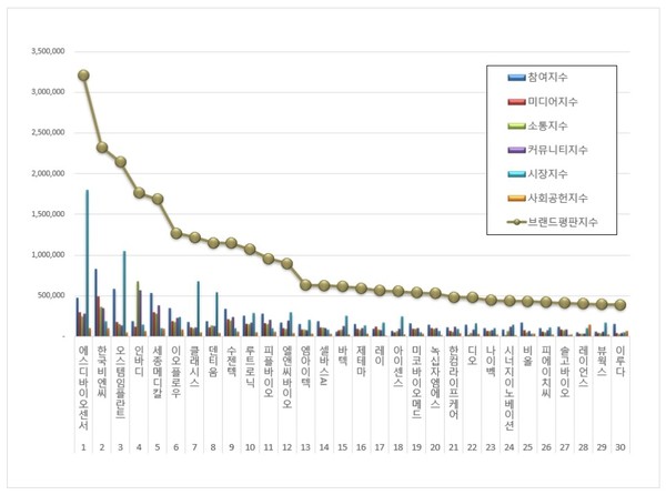 3위, 오스템임플란트 브랜드는 참여지수 584,211 미디어지수 174,317 소통지수 156,898 커뮤니티지수 135,716 시장지수 1,045,479 사회공헌지수 47,400이 되면서 브랜드평판지수 2,144,021로 분석됐다. 지난 11월 브랜드평판지수 2,003,292와 비교해보면 7.02% 상승했다.
