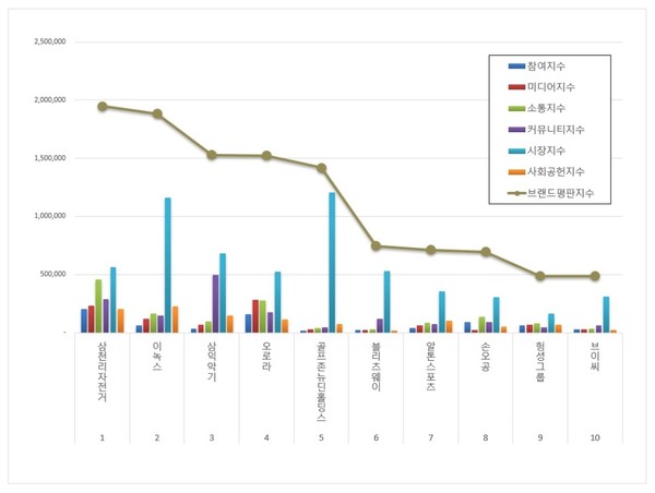 3위, 삼익악기 브랜드는 참여지수 32,779 미디어지수 69,156 소통지수 98,099 커뮤니티지수 497,957 시장지수 683,432 사회공헌지수 146,922가 되면서 브랜드평판지수 1,528,345로 분석됐다. 지난 11월 브랜드평판지수 1,485,744와 비교해보면 2.87% 상승했다.
