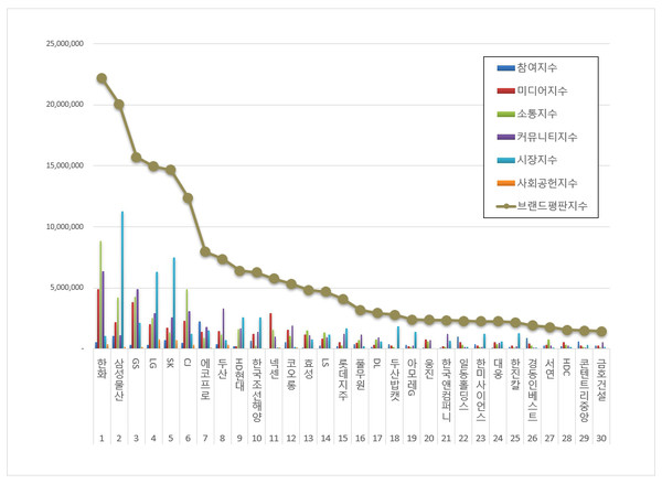지주사 상장기업 브랜드평판 1위를 기록한 한화 브랜드는 참여지수 569,852 미디어지수 4,898,944 소통지수 8,856,130 커뮤니티지수 6,388,632 시장지수 1,051,821 사회공헌지수 404,515가 되면서 브랜드평판지수 22,169,894로 분석됐다. 지난 11월 브랜드평판지수 26,180,944와 비교해보면 15.32% 하락했다.