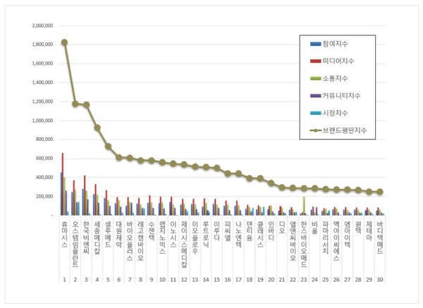 의료기기 상장기업 브랜드평판 1위를 기록한 휴마시스 브랜드는 참여지수 454,150 미디어지수 660,202 소통지수 404,144 커뮤니티지수 264,140 시장지수 45,431이 되면서 브랜드평판지수 1,828,066으로 분석됐다. 지난 11월 브랜드평판지수 8,286,534와 비교해보면 77.94% 하락했다.