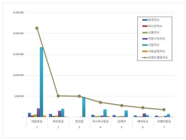 항공사 상장기업 브랜드평판 분석은 참여지수, 미디어지수, 소통지수, 커뮤니티지수, 시장지수, 사회공헌지수로 구분하여 브랜드평판지수를 산출했다.