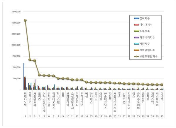 3위, 서울반도체 브랜드는 참여지수 133,206 미디어지수 223,117 소통지수 307,604 커뮤니티지수 459,919 시장지수 153,164 사회공헌지수 25,855가 되면서 브랜드평판지수 1,302,865로 분석됐다. 지난 12월 브랜드평판지수 1,145,806과 비교해보면 13.71% 상승했다.