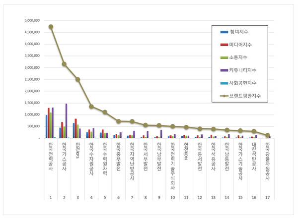 에너지 공기업 브랜드평판 1위를 기록한 한국전력공사 브랜드는 참여지수 989,181 미디어지수 1,295,499 소통지수 1,094,723 커뮤니티지수 1,309,838 사회공헌지수 50,961이 되면서 브랜드평판지수 4,740,201로 분석됐다. 지난 12월 브랜드평판지수 2,410,910과 비교해보면 96.61% 상승했다.