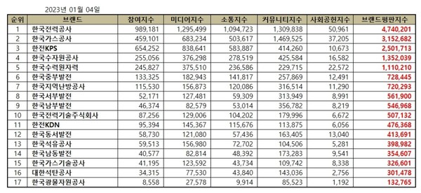 2023년 1월 에너지 공기업 브랜드평판 순위는 한국전력공사, 한국가스공사, 한전KPS, 한국수자원공사, 한국수력원자력, 한국중부발전, 한국지역난방공사, 한국서부발전, 한국남부발전, 한국전력기술주식회사, 한전KDN, 한국동서발전, 한국석유공사, 한국남동발전, 한국가스기술공사, 대한석탄공사, 한국광물자원공사 순으로 분석됐다.