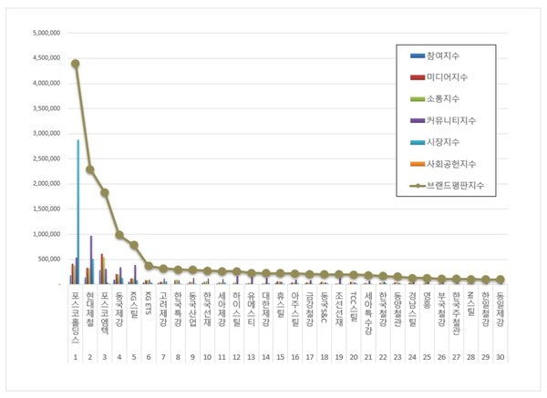 철강 상장기업 브랜드평판 1위를 기록한 포스코홀딩스 브랜드는 참여지수 187,372 미디어지수 407,513 소통지수 378,650 커뮤니티지수 539,952 시장지수 2,878,426 사회공헌지수 12,233이 되면서 브랜드평판지수 4,404,147로 분석됐다. 지난 12월 브랜드평판지수 4,636,259와 비교해보면 5.01% 하락했다.