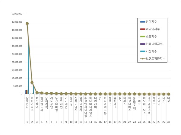 반도체 상장기업 브랜드평판 1위를 기록한 삼성전자 브랜드는 참여지수 2,530,020 미디어지수 2,552,829 소통지수 2,543,542 커뮤니티지수 2,992,775 시장지수 33,491,295가 되면서 브랜드평판지수 44,110,462로 분석됐다. 지난 12월 브랜드평판지수 51,158,759와 비교해보면 13.78% 하락했다.