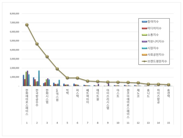 2위, 한국항공우주 브랜드는 참여지수 970,125 미디어지수 768,176 소통지수 536,143 커뮤니티지수 563,072 시장지수 1,728,173 사회공헌지수 108,984가 되면서 브랜드평판지수 4,674,673으로 분석됐다. 지난 12월 브랜드평판지수 5,532,133과 비교해보면 15.50% 하락했다.