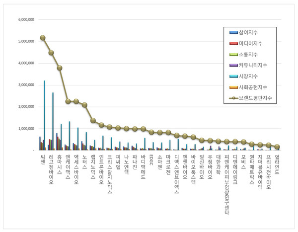 2위, 레고켐바이오 브랜드는 참여지수 254,065 미디어지수 513,685 소통지수 492,339 커뮤니티지수 481,264 시장지수 2,653,108 사회공헌지수 93,968이 되면서 브랜드평판지수 4,488,428로 분석됐다. 지난 12월 브랜드평판지수 2,928,594와 비교해보면 53.26% 상승했다.