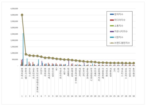 자동차부품 상장기업 브랜드평판 1위를 기록한 현대모비스 브랜드는 참여지수 119,970 미디어지수 489,402 소통지수 284,951 커뮤니티지수 543,370 시장지수 2,581,558이 되면서 브랜드평판지수 4,019,251로 분석됐다. 지난 12월 브랜드평판지수 4,920,815와 비교해보면 18.32% 하락했다.