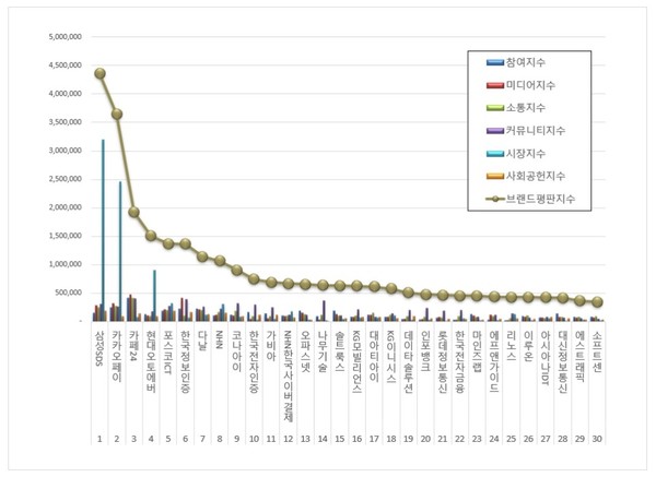 5위, 포스코ICT 브랜드는 참여지수 184,510 미디어지수 209,994 소통지수 194,921 커뮤니티지수 274,135 시장지수 322,618 사회공헌지수 184,414가 되면서 브랜드평판지수 1,370,591로 분석됐다. 지난 12월 브랜드평판지수 1,655,469와 비교해보면 17.21% 하락했다.