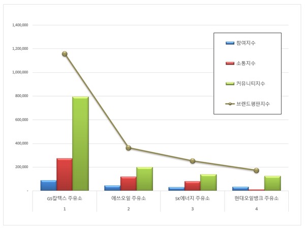 주유소 브랜드평판 1위를 기록한 GS칼텍스 주유소 브랜드는 참여지수 88,932 소통지수 273,583 커뮤니티지수 794,924가 되면서 브랜드평판지수 1,157,439로 분석됐다. 지난 12월 브랜드평판지수 1,438,324와 비교해보면 19.53% 하락했다.