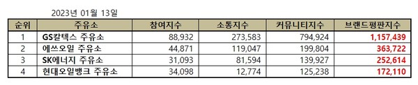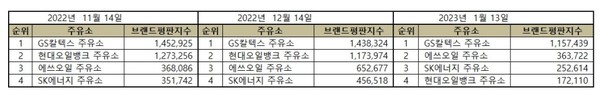 이넷뉴스와 한국기업평판연구소는 소비자들에게 사랑받는 주유소 브랜드에 대해 브랜드 빅데이터를 통한 평판조사를 하였다. 4개 주유소 브랜드평판 분석은 2022년 12월 13일부터 2023년 1월 13일까지의 주유소 브랜드 빅데이터 1,945,885개를 분석하여 소비자들의 브랜드 습관과 브랜드와 관계 분석을 통해 브랜드평판을 분석하였다. 지난 12월 브랜드 빅데이터 3,721,493개와 비교하면 47.71% 줄어들었다.