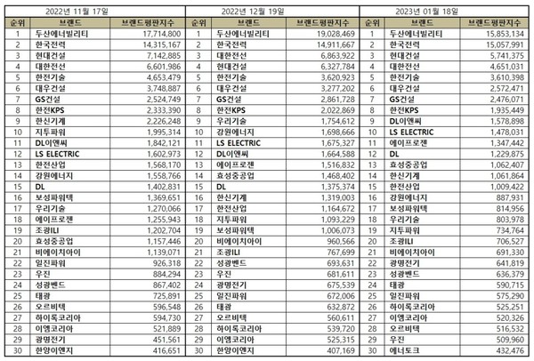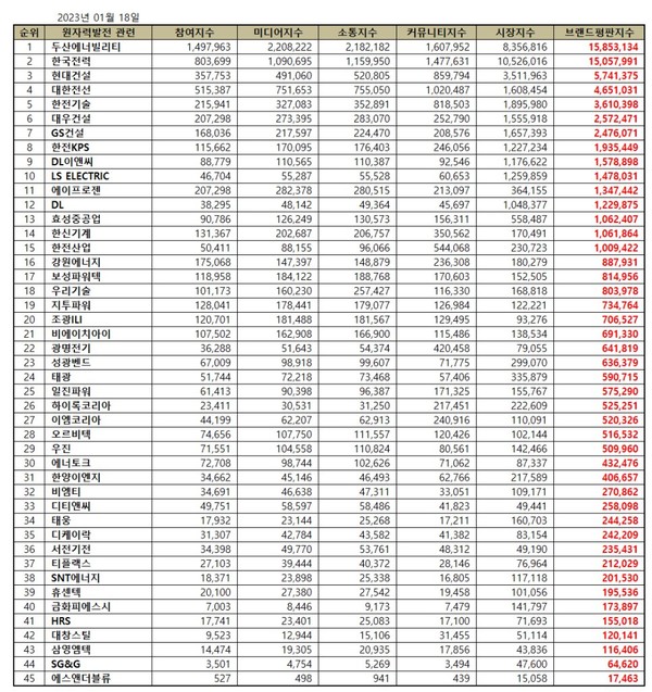 원자력발전 관련 상장기업 브랜드평판 2023년 1월 빅데이터 분석 30위 순위는 두산에너빌리티, 한국전력, 현대건설, 대한전선, 한전기술, 대우건설, GS건설, 한전KPS, DL이앤씨, LS ELECTRIC, 에이프로젠, DL, 효성중공업, 한신기계, 한전산업, 강원에너지, 보성파워텍, 우리기술, 지투파워, 조광ILI, 비에이치아이, 광명전기, 성광벤드, 태광, 일진파워, 하이록코리아, 이엠코리아, 오르비텍, 우진, 에너토크 순이었다.