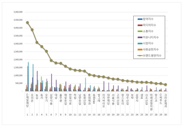 4위, 동서 브랜드는 참여지수 91,385 미디어지수 559,320 소통지수 940,878 커뮤니티지수 541,030 시장지수 689,658 사회공헌지수 16,525가 되면서 브랜드평판지수 2,838,796으로 분석됐다. 지난 12월 브랜드평판지수 2,216,124와 비교해보면 28.10% 상승했다.