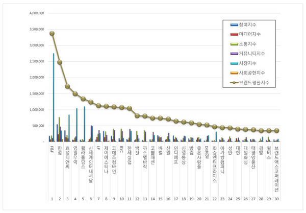 3위, 효성티앤씨 브랜드는 참여지수 365,586 미디어지수 154,318 소통지수 215,074 커뮤니티지수 118,905 시장지수 844,063 사회공헌지수 35,039가 되면서 브랜드평판지수 1,732,985로 분석됐다. 지난 12월 브랜드평판지수 1,854,649와 비교해보면 6.56% 하락했다.