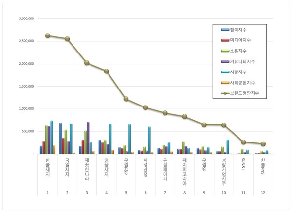 3위, 깨끗한나라 브랜드는 참여지수 188,211 미디어지수 323,635 소통지수 591,182 커뮤니티지수 445,541 시장지수 257,570 사회공헌지수 61,947이 되면서 브랜드평판지수 1,868,086으로 분석됐다. 지난 12월 브랜드평판지수 2,021,085와 비교해보면 7.57% 하락했다.