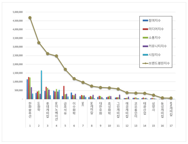 석유화학 관련 상장기업 브랜드평판 1위를 기록한 한화솔루션 브랜드는 참여지수 1,142,254 미디어지수 1,269,419 소통지수 1,245,591 커뮤니티지수 691,450 시장지수 328,678이 되면서 브랜드평판지수 4,677,393으로 분석됐다. 지난 12월 브랜드평판지수 5,049,745와 비교해보면 7.37% 하락했다.
