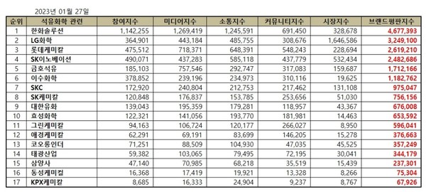 이넷뉴스와 한국기업평판연구소는 석유화학 관련 상장기업 17개 브랜드에 대해서 빅데이터 분석을 활용한 브랜드 평판조사를 실시하였다. 2022년 12월 27일부터 2023년 1월 27일까지의 석유화학 관련 상장기업 브랜드 빅데이터 21,038,783개를 분석하여 소비자들의 브랜드 평판을 분석하였다. 지난 12월 석유화학 관련 상장기업 브랜드 빅데이터 25,347,874개와 비교하면 17.00% 줄어들었다.