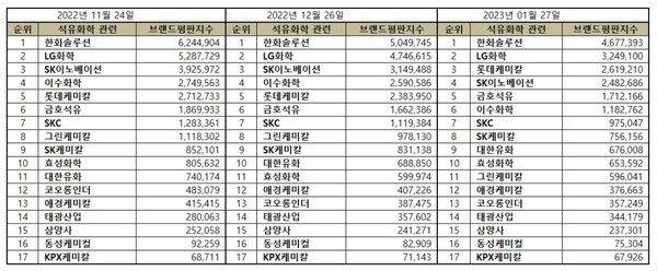 [이넷뉴스] 2023년 1월 석유화학 관련 상장기업 브랜드평판이 공개됐다.
