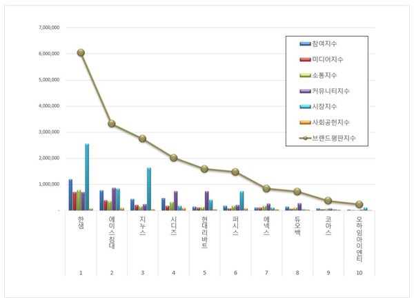 5위, 현대리바트 브랜드는 참여지수 144,534 미디어지수 120,816 소통지수 138,033 커뮤니티지수 731,705 시장지수 410,668 사회공헌지수 48,628이 되면서 브랜드평판지수 1,594,384로 분석됐다. 지난 12월 브랜드평판지수 1,470,626과 비교해보면 8.42% 상승했다.