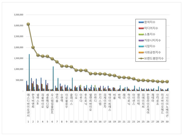 4위, 피플바이오 브랜드는 참여지수 611,602 미디어지수 337,356 소통지수 315,126 커뮤니티지수 123,864 시장지수 101,645 사회공헌지수 116,312가 되면서 브랜드평판지수 1,605,904로 분석됐다. 지난 12월 브랜드평판지수 958,881과 비교해보면 67.48% 상승했다.