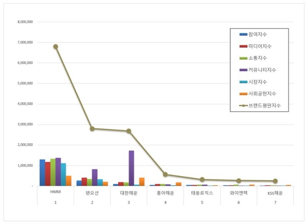 해운 상장기업 브랜드평판 1위를 기록한 HMM 브랜드는 참여지수 1,293,892 미디어지수 1,182,253 소통지수 1,332,332 커뮤니티지수 1,379,620 시장지수 1,115,193 사회공헌지수 501,868이 되면서 브랜드평판지수 6,805,157로 분석됐다. 지난 12월 브랜드평판지수 7,200,268과 비교해보면 5.49% 하락했다.