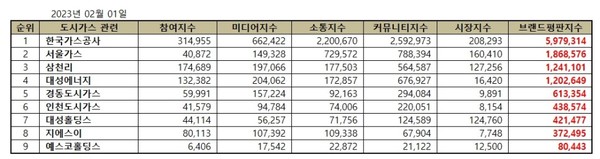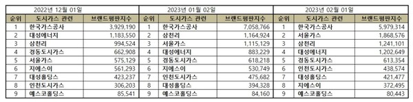 이넷뉴스와 한국기업평판연구소는 도시가스 상장기업 9개 브랜드에 대해서 빅데이터 분석을 활용한 브랜드 평판조사를 실시하였다. 2023년 1월 1일부터 2023년 2월 1일까지의 도시가스 상장기업 브랜드에 대한 국내 소비자 빅데이터 12,217,982개를 분석하여 소비자들의 브랜드 평판을 분석하였다. 지난 1월 도시가스 상장기업 브랜드 빅데이터 12,325,186개와 비교하면 0.87% 줄어들었다.