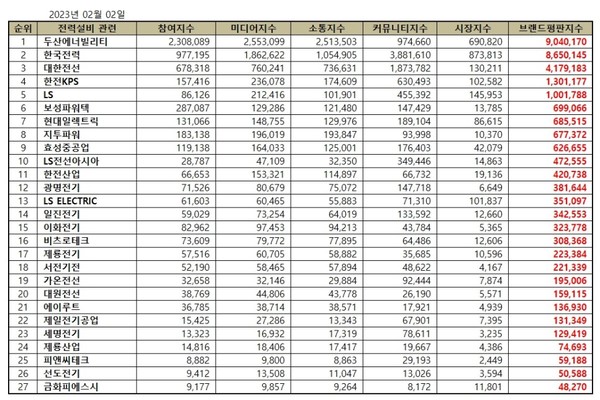 이넷뉴스와 한국기업평판연구소는 전력설비 상장기업 27개 브랜드에 대해서 빅데이터 분석을 활용한 브랜드 평판조사를 실시했다. 2022년 1월 2일부터 2023년 2월 2일까지의 전력설비 상장기업 브랜드에 대한 국내 소비자 빅데이터 30,891,084개를 분석하여 소비자들의 브랜드 평판을 분석했다. 지난 1월 전력설비 상장기업 브랜드 빅데이터 26,464,852개와 비교하면 16.72% 증가했다.